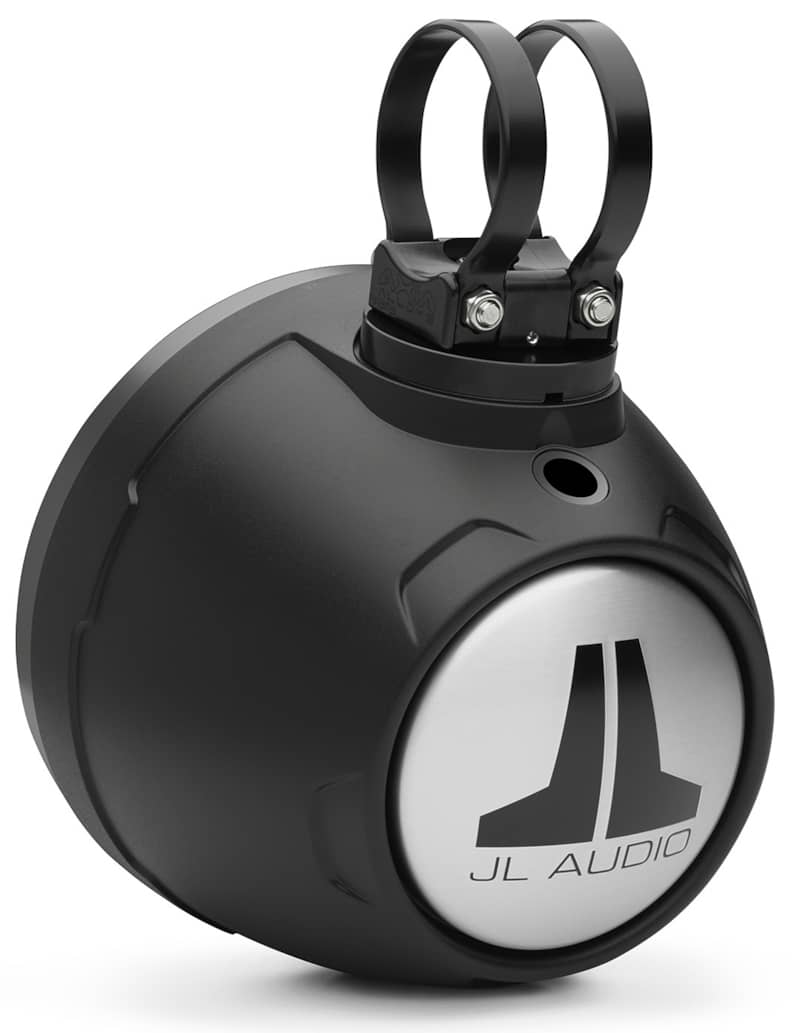 JL Audio 93413 M6 Series 6.5″ Marine Enclosed Coaxial Speaker System (Pair)M6 6.5-inch Marine Enclosed Coaxial Speaker System (75 W, 4 Ω) – Matte Black Enclosure, Gunmetal Trim Ring, Titanium Sport Grille Ideal for powersports, marine and off-road vehicle applications, these enclosed speaker systems include our maximum-performance, M6 6.5-inch marine coaxial speakers with silk dome tweeters housed in rugged, injection-molded enclosures to deliver clean, loud audio. A rotating clamp receiver is included with each VEX™ pod to mate with an appropriate fixture (sold separately) for mounting to a flat surface, roll-cage or tower structure, allowing precise aiming for optimum sound. Pipe mounting fixtures (sold separately) are available in a variety of sizes to fit a wide range of tube diameters. The enclosures feature a decorative, aluminum logo cap on the end opposite the speaker, which can be oriented to match any custom mounting application. For convenience, ten feet of our 16AWG marine-grade, parallel conductor speaker cable is included with each VEX™ pod. Although VEX™ pods can be used with as little as 25 W per channel, we recommend powering these systems with an amplifier capable of 75-150 W of continuous power per channel. For best results, use with a subwoofer. Like all JL Audio marine speakers, this system is weatherproof and built to deliver years of listening enjoyment. Sold as a pair. Specifications